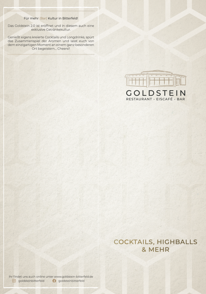Ein zentraler Bestandteil unseres Konzeptes für das Goldstein ist unsere tolle Cocktail Karte. Wir möchten die Barkultur in Bitterfeld wieder aufleben lassen.