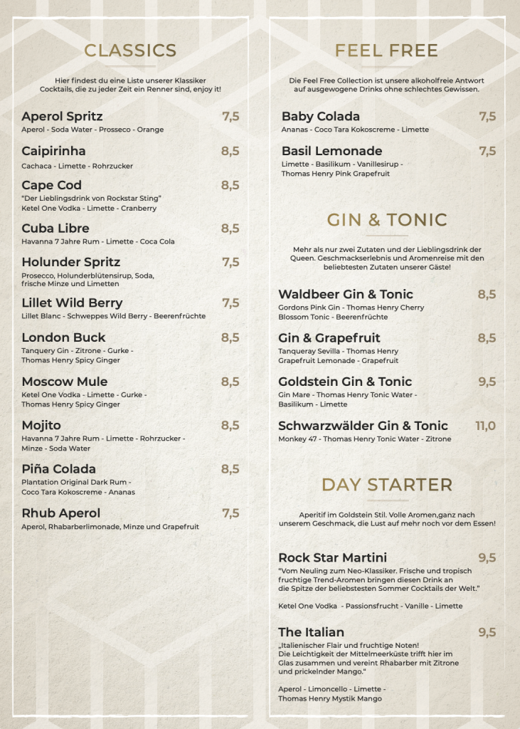 Nicht nur das Goldstein selbst bekommt einen neuen Anstrich – mit unserer Barkarte möchten wir auch die After Work Culture in Bitterfeld neu auflegen! Komm mit Deinen Arbeitskollegen auf einen kühlen Drink und ein paar gute Gespräche vorbei und lass den Tag gebührend ausklingen.
